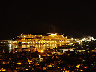the seas das companhias Royal Caribbean Cruise Line e o Carnival Valor e o Carnival Conquest da Carnival Cruise Line. É engraçado ver os navios atracados por companhias por cada pontão e verificar o pequeno pontão onde os grandes navios atracam lado a lado neste porto.Norwegian Epic no Mediterrâneo em 2011