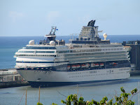 O Braemar de Olsen Cruise Lines, chega começada a manhã em forte contraluz (mudança de hora), procedente de Dover e Funchal. Às 1700h tomará rumo a St Maartens, Antilhas Holandesas.